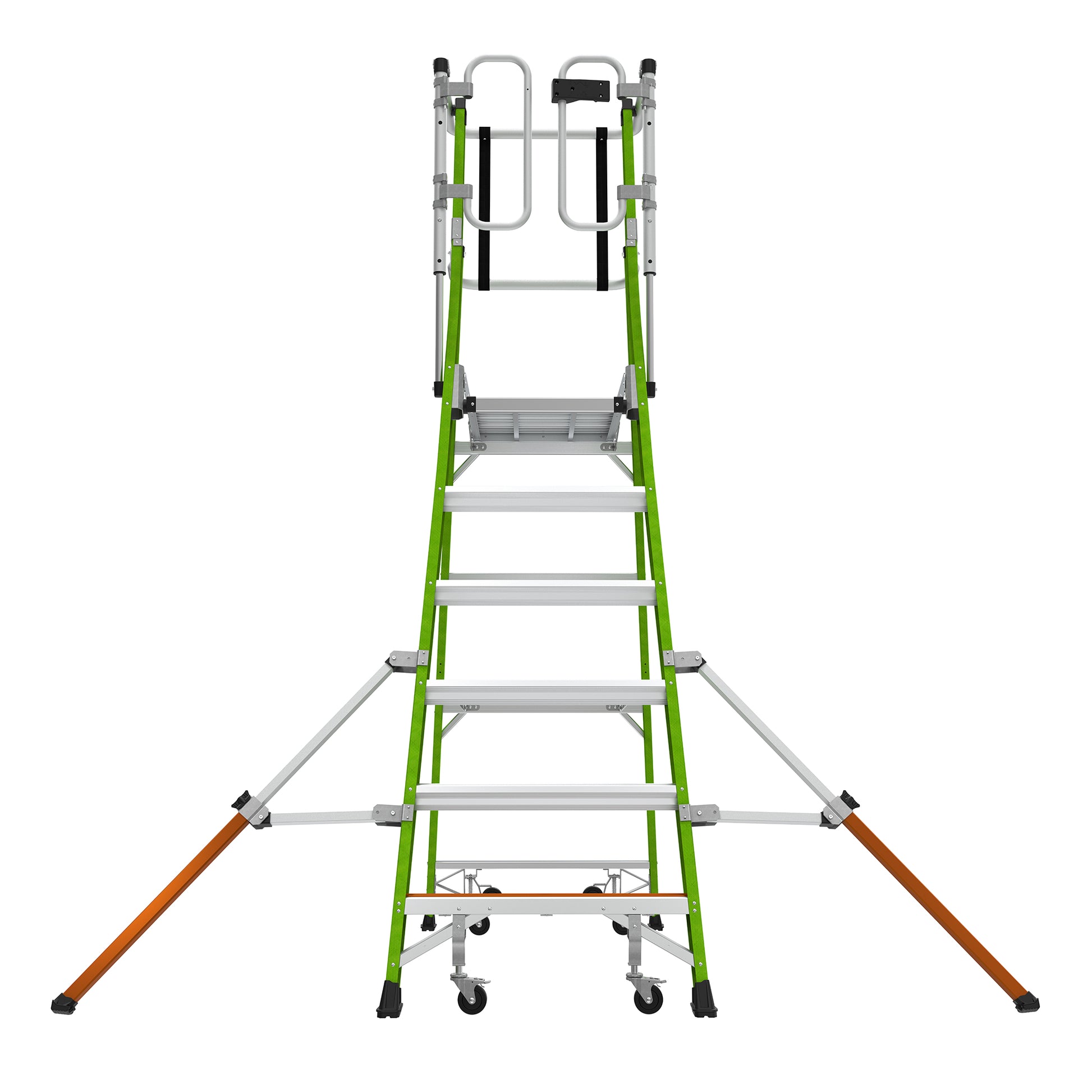 Stay compliant with EN131-7 and OSHA standards without the hassle of tying off to an anchor point. The Safety Cage features adjustable outriggers that significantly increase side-tip stability, making it the most reliable climbing solution for busy job sites.