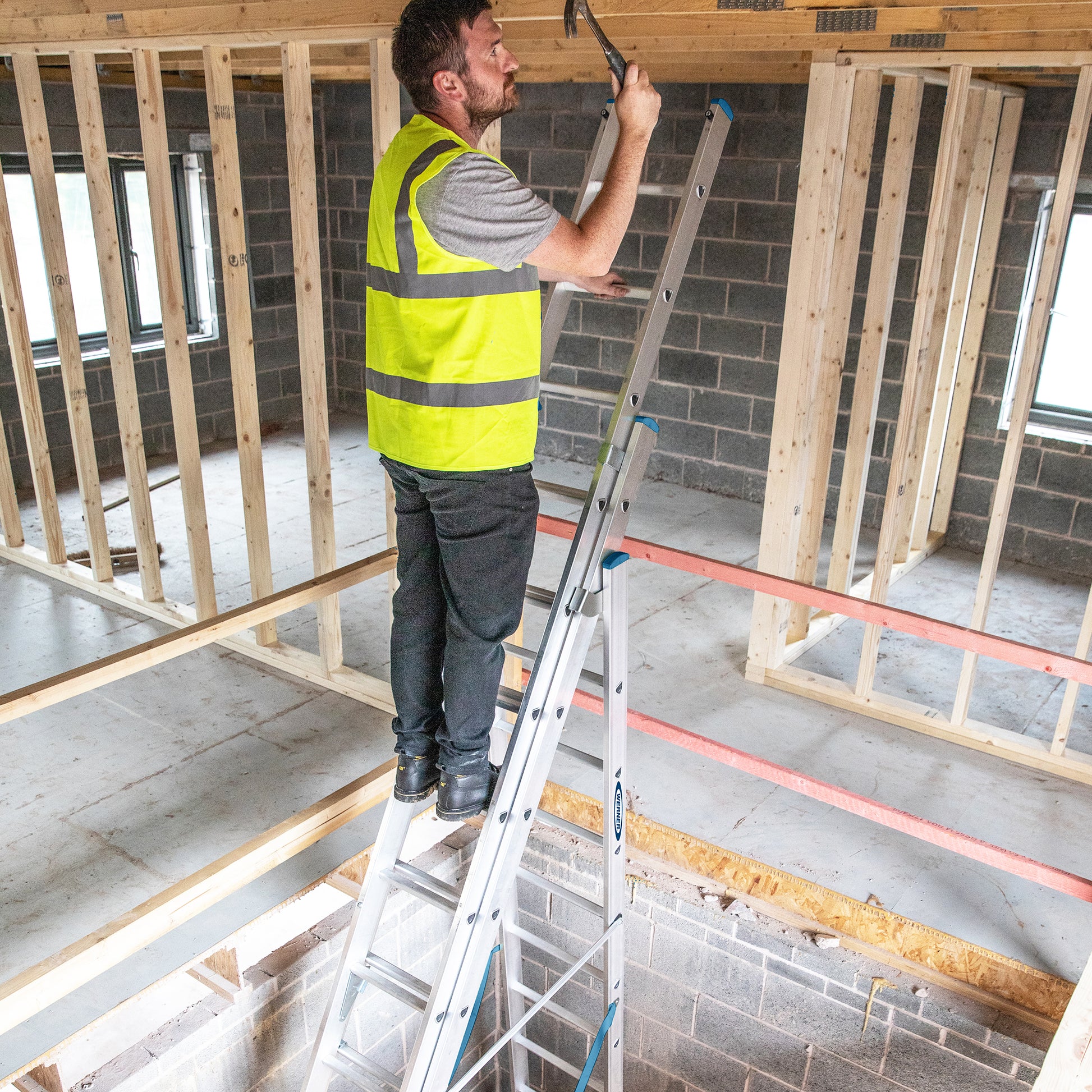 The Werner ExtensionPLUS™ X4 Ladder is the ultimate professional multi-function ladder designed for versatility and safety on any job site. This triple-section combination ladder quickly converts into four essential modes: a large stepladder, a standard extension ladder, a freestanding extension ladder, and a stairwell ladder, offering unbeatable flexibility.